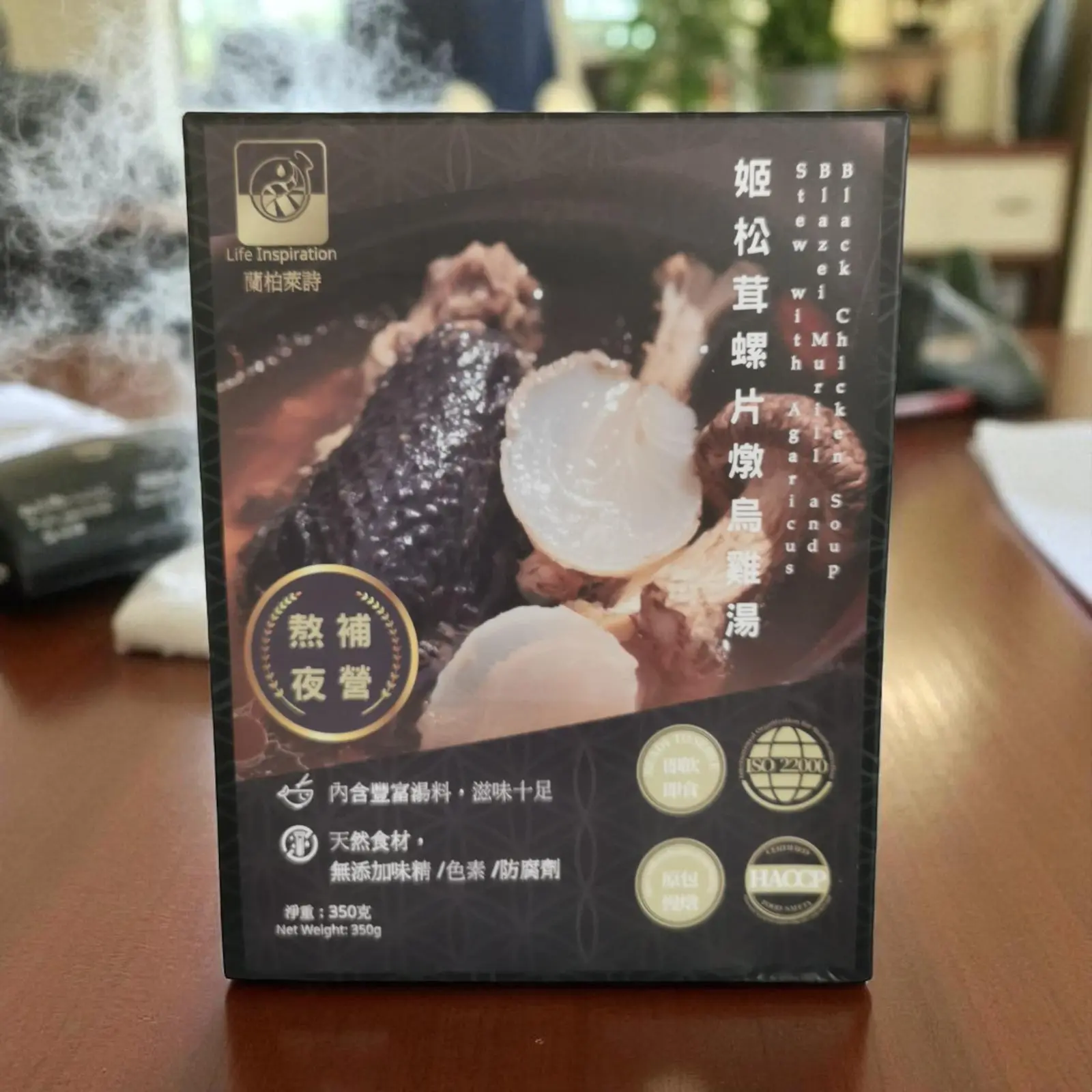 湯品主要以「菌中珍品」之稱的姬松茸(又名巴西蘑菇),滋陰補腎的螺片(乾響螺片),以及滋補身體的烏雞燉製而成。